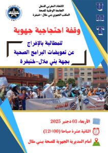 وفي السياق نفسه، أصدر المكتب الجهوي للجامعة الوطنية للصحة بياناً يعلن فيه عن تنظيم وقفة احتجاجية جهوية في التاريخ والمكان نفسيهما، وذلك تبعاً لاجتماع المكتب المنعقد في 19 نونبر 2025. المكتب الجهوي حمّل الإدارة الجهوية ووزارة الصحة مسؤولية “استمرار تجاهل” تمكين الشغيلة الصحية بالجهة من تعويضات البرامج الصحية قبل صدور المرسوم، رغم المراسلات المؤرخة في 8 يوليوز 2025 والموجهة للمدير الجهوي ولمناديب الوزارة بأقاليم الجهة.