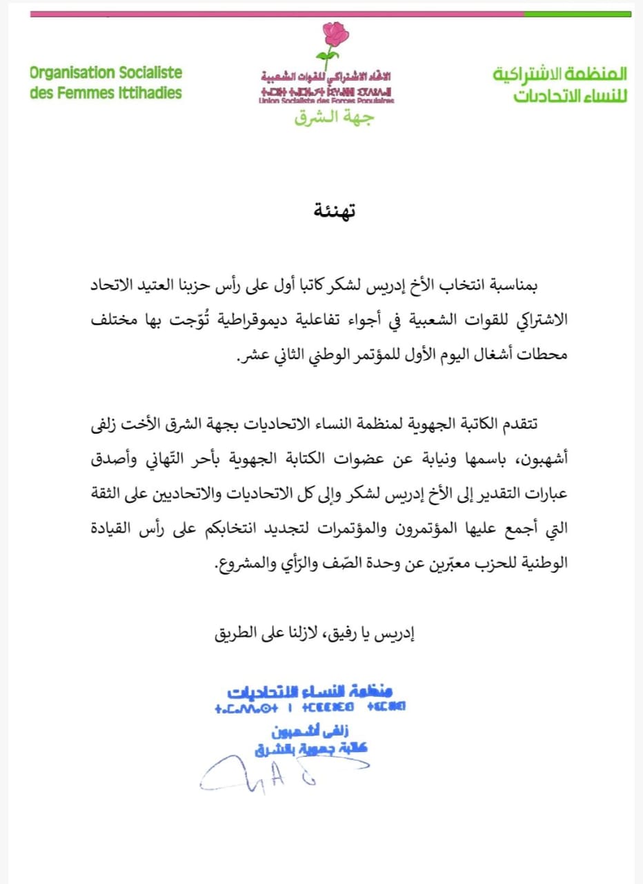 توصلت جريدة أرض بلادي بوثيقة تهنئة رسمية موجهة إلى الأخ إدريس لشكر، بمناسبة انتخابه كاتبًا أول لحزب الاتحاد الاشتراكي للقوات الشعبية، صادرة عن منظمة النساء الاتحاديات – جهة الشرق – وتحمل توقيع الكاتبة الجهوية السيدة زلفى أشهبون.