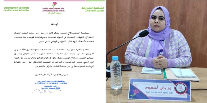زلفى أشهبون الكاتبة الجهوية للنساء الاتحاديات بالشرق تُهنئ إدريس لشكر بانتخابه كاتبًا أول.. وتؤكد استمرار دعمها لقيادة الحزب ووحدة الصف الاتحادي