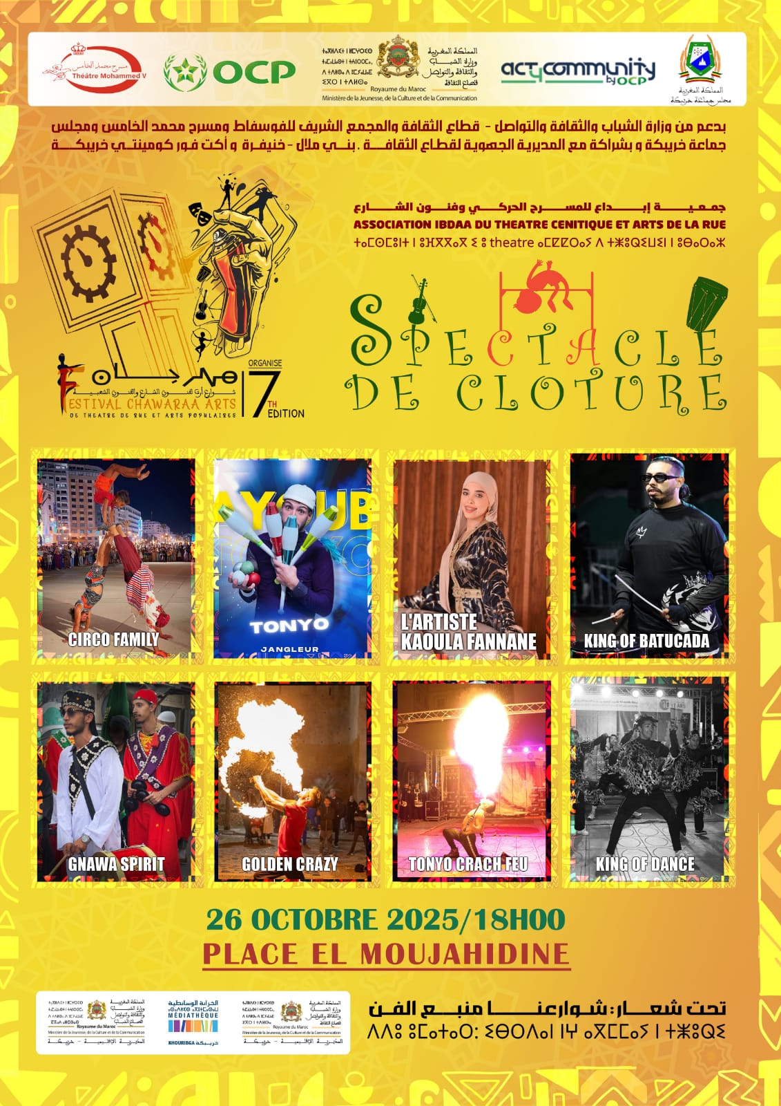 فقرات الدورة، التي تقام تحت شعارٍ “شوارعنا منبع الفن” بدعم من وزارة الشباب والثقافة والتواصل – قطاع الثقافة، والمجمع الشريف للفوسفاط، ومسرح محمد الخامس، ومجلس جماعة خريبكة، إلى جانب شراكات ثقافية ومؤسساتية متعددة، منها المديرية الجهوية لقطاع الثقافة بجهة بني ملال خنيفرة، و”اكت فور كومينوتي خريكبة”، والخزانة الوسائطية (م.ش.ف)، والمديريتان الإقليميتان للثقافة والشباب بخريبكة، ستشمل مزيجا خصبا من المسرح والسيرك، وعروض غرافيتي، ورسم جداريات، وتنشيط أطفال، فضلا عن عروض لمسرح الشارع وغيره.