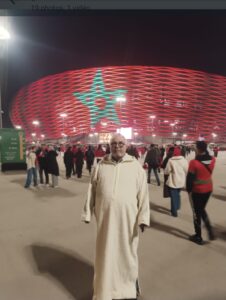 دروج متسعة ولم نصل إلى الكرسي المخصص لنا إلا بشق الأنفس … منظر تقشعر منه الابدان ملعب غاية في الجمال كله اضواء وأرضية معشوشبة عشبا طبيعيا يبهر العين ويسر القلب ، مساحة كبيرة مغطاة غطاء جميلا كله اضواء تتلألأ العلم المغربي الأحمر ونجمته الخماسية الخضراء في الصور ومحمولة على الأيادي وفي القلوب واغلب الناس يرتديها سلهاما اعد لهذه المناسبة العزيزة والأغلبية الساحقة ترتدي العلم المغربي قميصا حتى اصبح الجميع علما مغربيا موحدا يرتديه الجميع ،،،